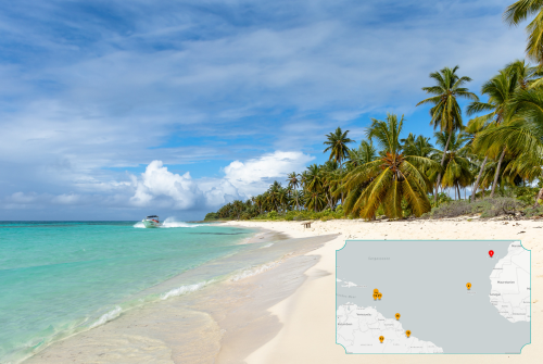 Idyllischer tropischer Strand mit weißen Sand, türkisblauem Wasser und zahlreichen Palmen unter einem sonnigen Himmel; ein kleines Boot liegt nahe am Ufer. Unten rechts ist eine kleine Karte eingeblendet, auf der mehrere markierte Punkte die Route der Kreuzfahrt durch eine Inselregion anzeigen.