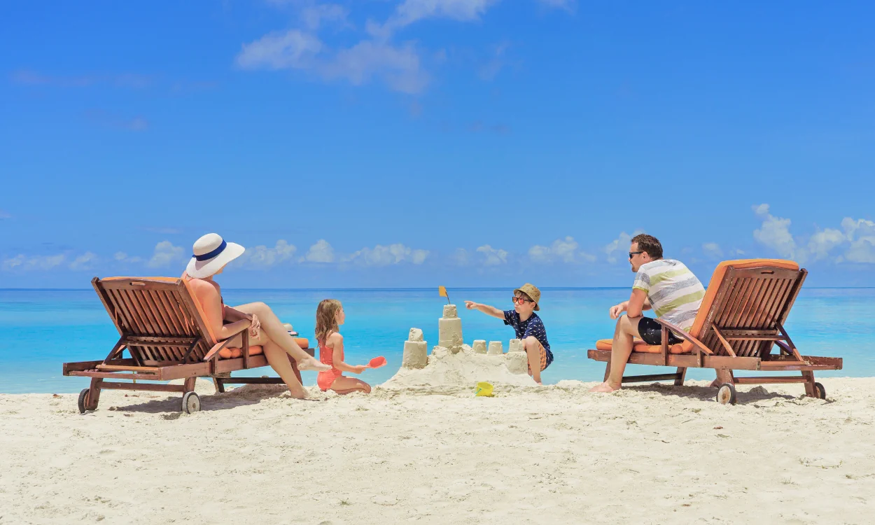 Thailändisches Longtail-Boot an einem weißen Strand vor einem riesigen, bewachsenen Kalksteinfelsen im klaren, türkisen Meer unter blauem Himmel.